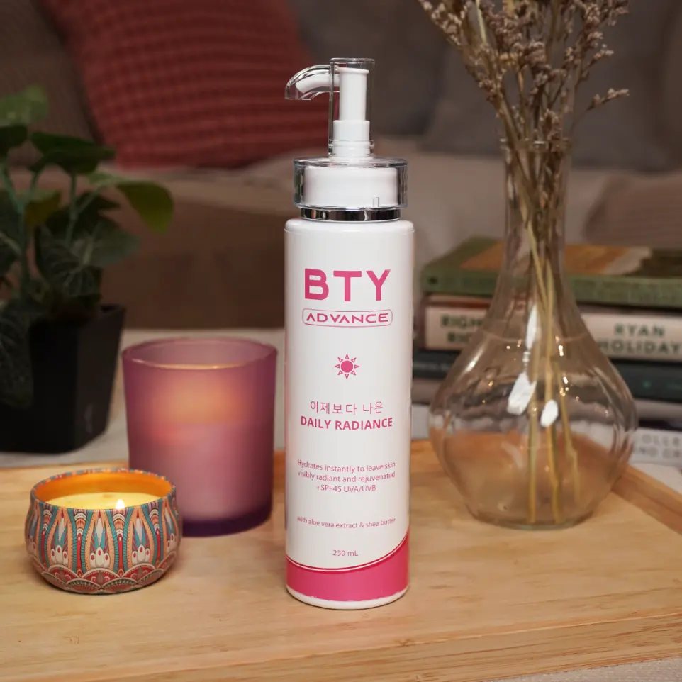 Glow and protect—every day. BTY Advance Daily Radiance SPF 45 PA++ is a lightweight sunscreen designed to hydrate, protect, and refresh the skin without leaving a white cast. Its smooth, non-greasy texture blends easily, making it ideal for everyday wear.